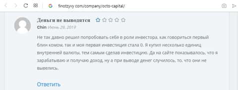 Chin - пользователь, который пошел на поводу этих мошеннических обещаний, которые нам даёт инвестиционная компания ОКТО Капитал. Бывший клиент нормально зарабатывал на платформе-сайте без каких-либо обвалов и кризисов, и всё бы нормально, если бы он не захотел бы снять свои "заработанные" деньги. Вот тогда и оказалось, что эти деньги никак ему не принадлежат и вывести он их не может.