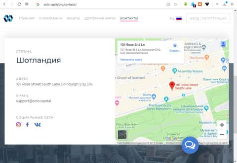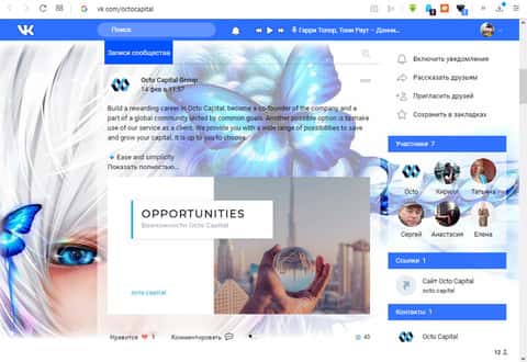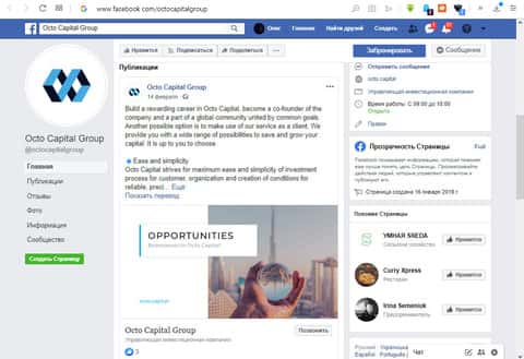 В социальной сети Facebook, довольно популярной в глобальной сети интернет, создана группа нашей конторы OCTO Capital, которая постит на своей странице множество записей с финансовыми новостями, которые имеют отношение к брокерству. Написание постов тут уже давным-давно было заброшено. Последняя запись - 9 месяцев назад. Поэтому можно с уверенностью сказать, что OCTO Capital - лохотрон и скам.