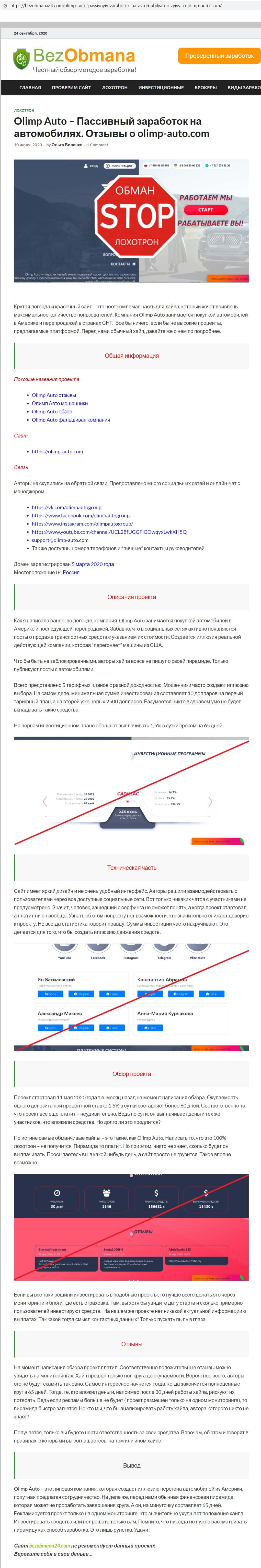 bezobmana24 com - информация о проекте аферистов Олимп Авто
