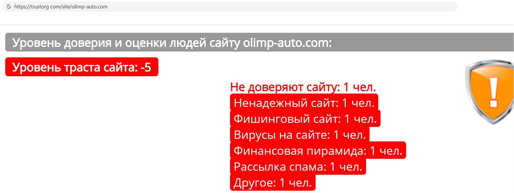 В поисках информации о аферистах Olimp-Auto мы наткнулись на интернет ресурс "Доверие в Сети". Оказалось, что данная контора имеет отрицательный уровень доверия среди интернет - пользователей.