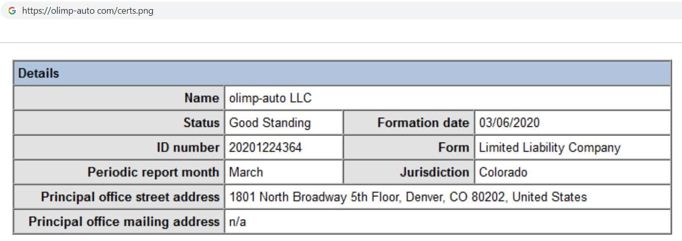 На своём главном интернет ресурсе, компания финансовых махинаторов представила своё юридическое лицо, которым в свою очередь является фирма Olimp-Auto LLC.