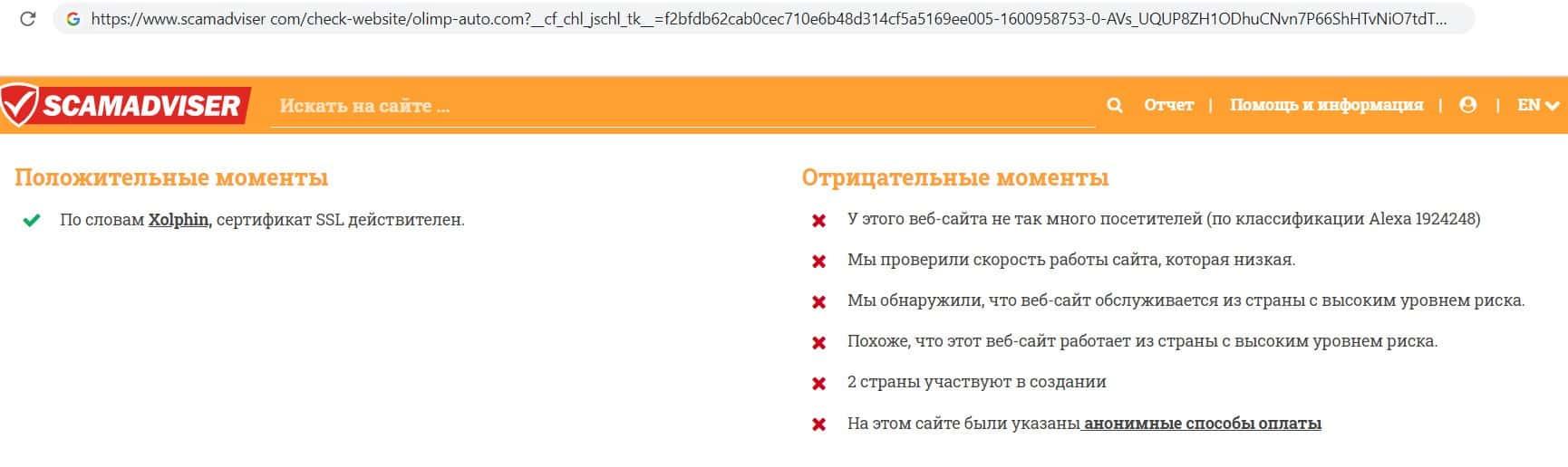 - Мнение интернет ресурса scamadviser com о конторе финансовых аферистов Olimp-Auto