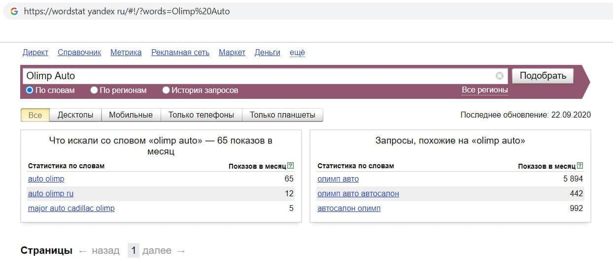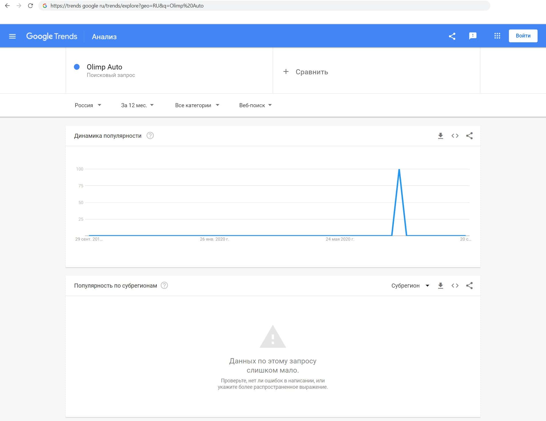 Так же мы проверили и количество запросов фирмы Olimp-Auto по названию компании, но с пробелом, а именно "Olimp Auto". Как мы видим, пользователи больше не выполняют данный запрос.