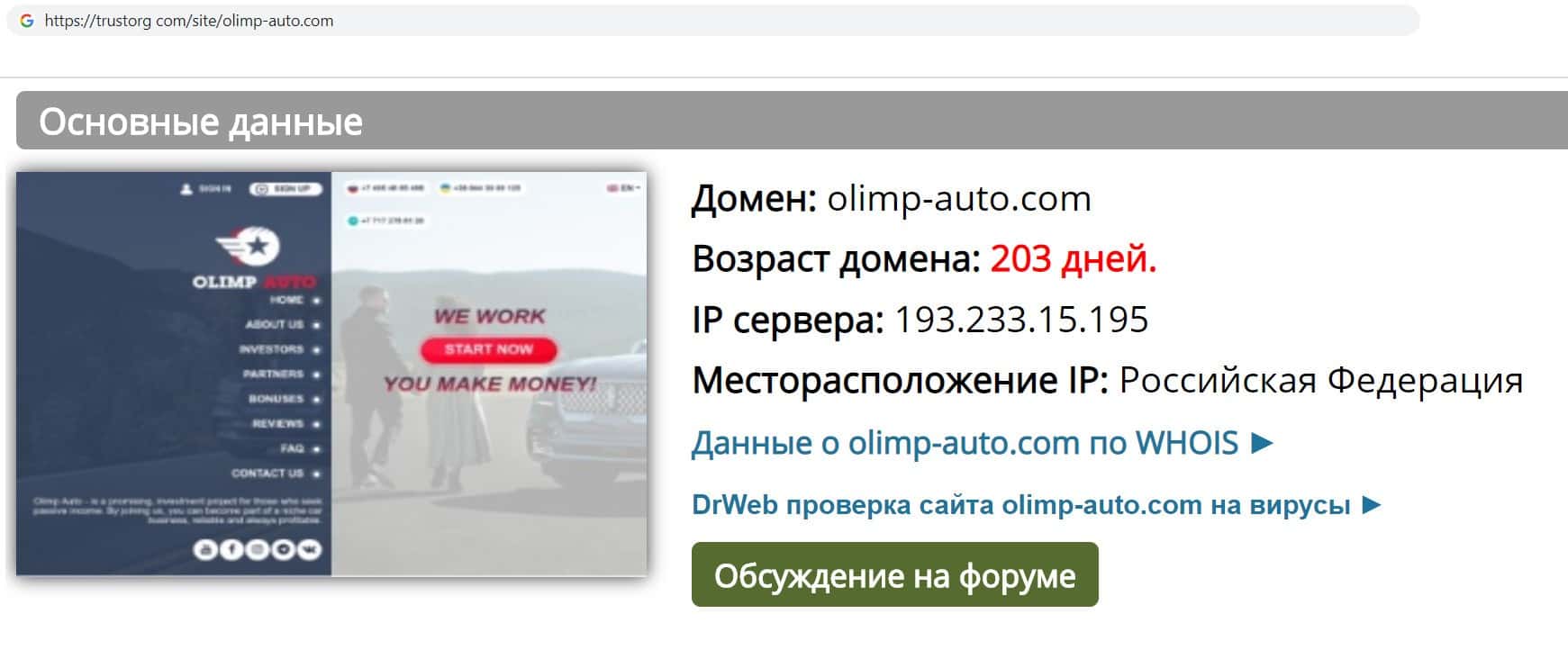 С помощью интернет ресурса "Доверие в Сети" мы узнали о возрасте компании Олимп Авто. Как оказалось, фирма существует менее года, это даёт нам понять, что это очередной хайп проект.