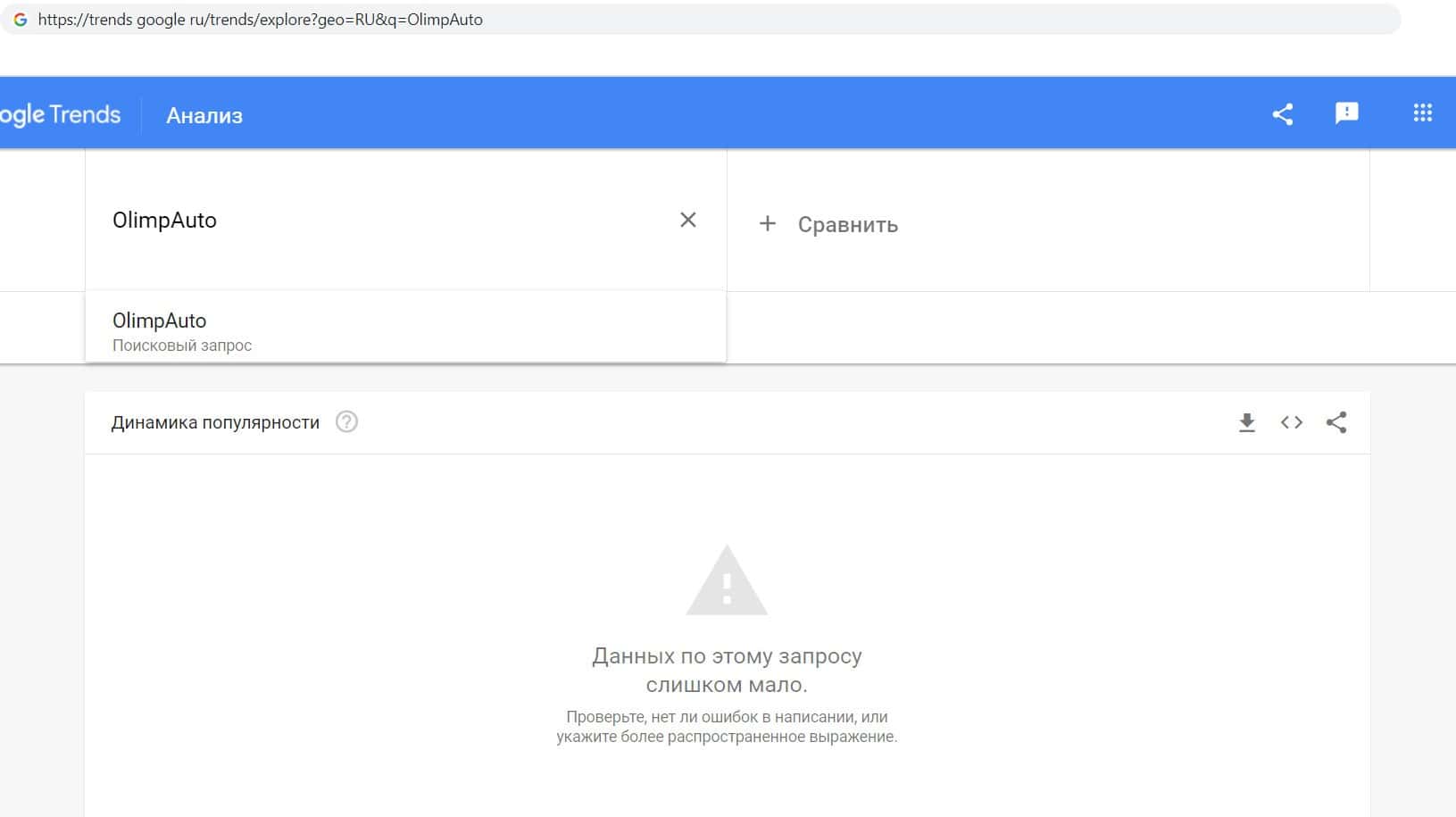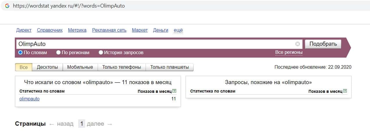 Ещё мы решили проверить количество запросов компании аферистов Олимп Авто по русскоязычному названию, но без пробела, а именно "ОлимпАвто". Но результата - нет.