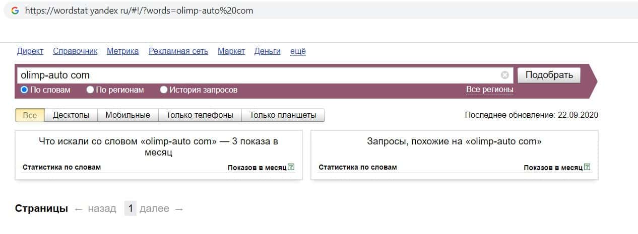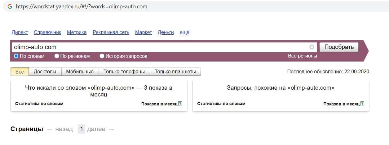Напоследок мы проверили количество запросов конторы кидал olimp-auto com по домену фирмы, но с точкой, а именно "olimp-auto.com". Но результат так же оказался - нулевым.