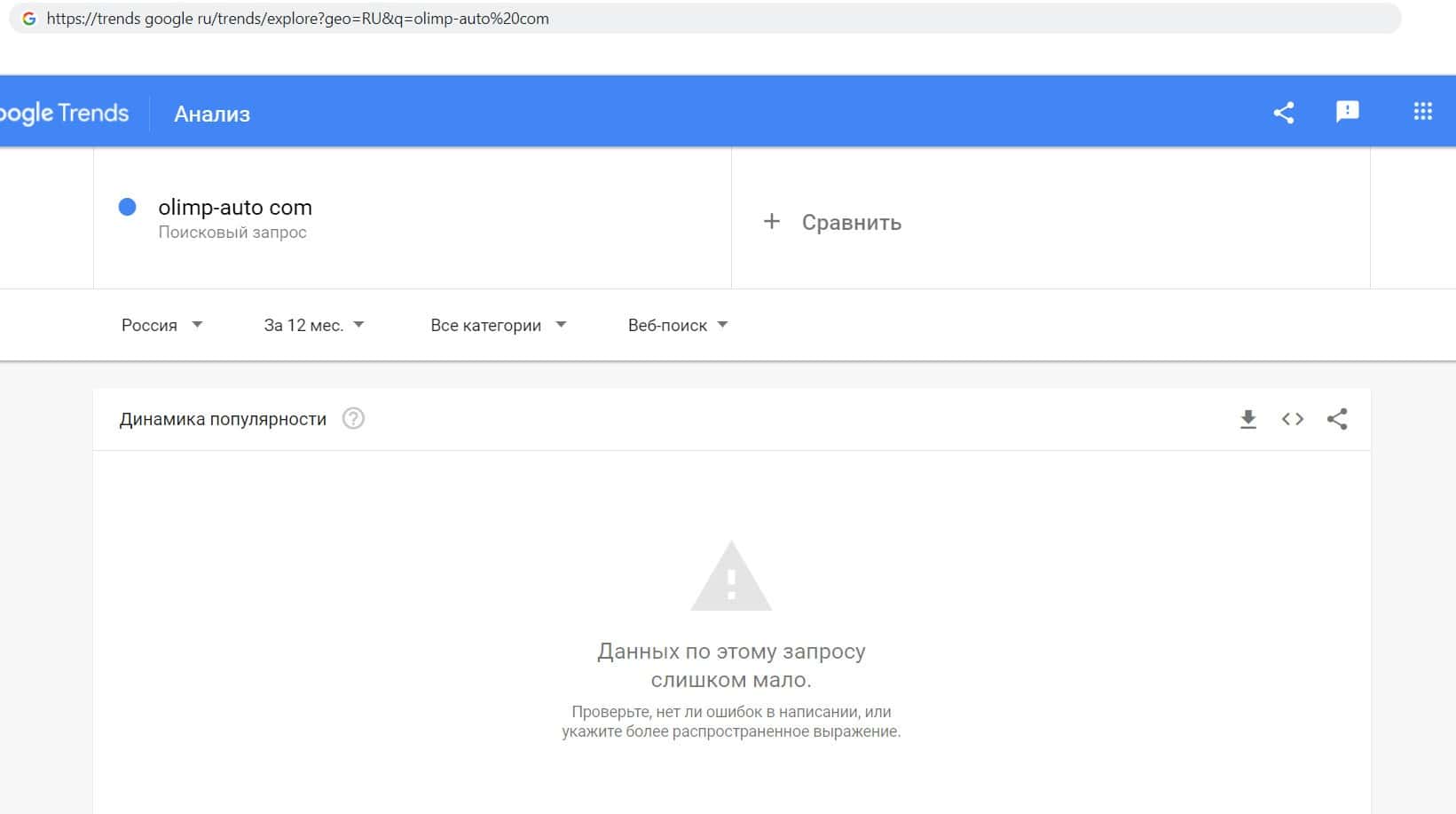 Так же проверили мы и количество запросов недоконторы Олимп Авто по домену компании, но без точки, а именно "olimp-auto com". Но увы, результата нет, целый год никто не выполняет данный запрос.