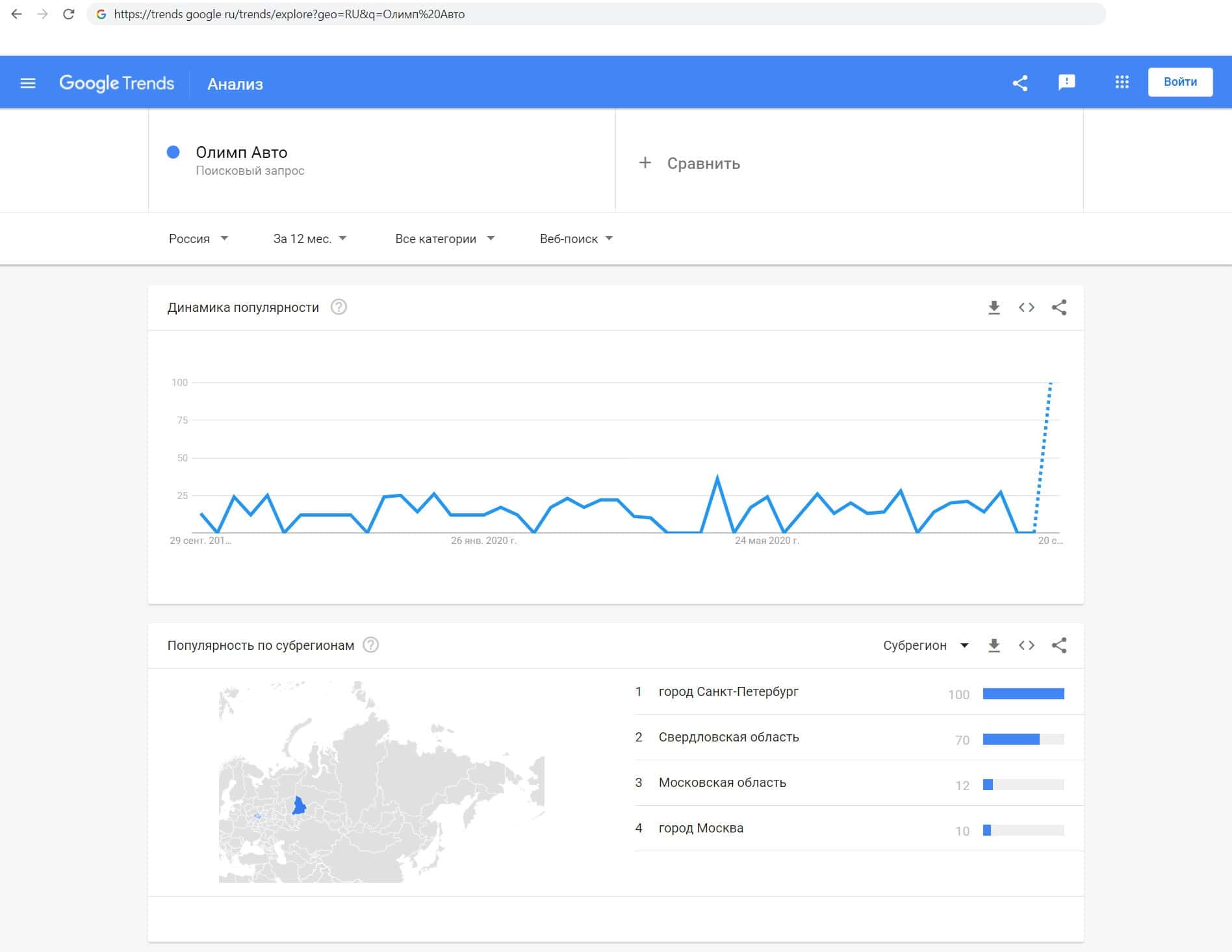 Так же мы решили проверить и количество запросов мошенников Olimp-Auto по русскоязычному названию компании, а именно "Олимп Авто". Как мы видим, данный запрос совершают только жители России.