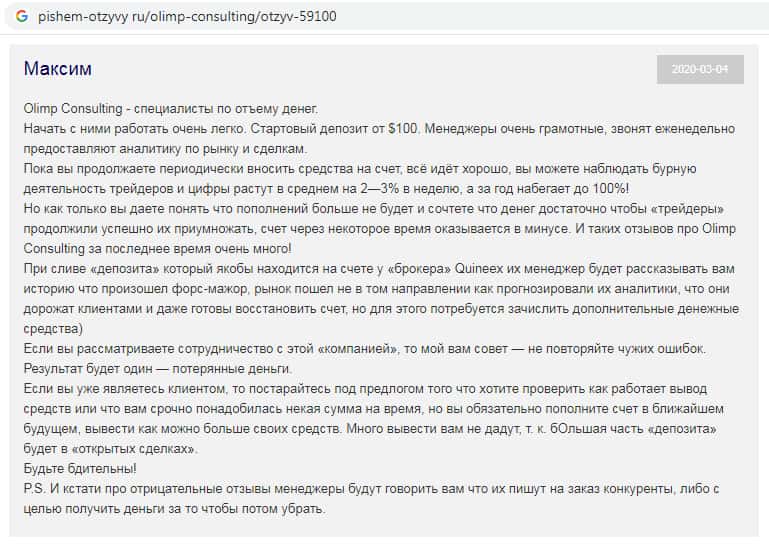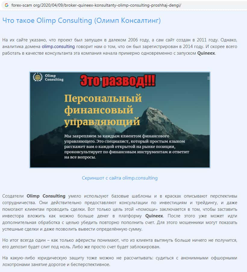 На сайте forex-scam org отыскана информация о том, что скам-организация Олимп Консалтинг заставляет людей торговать на сайте-скам-брокера Quineex, обещая золотые горы.