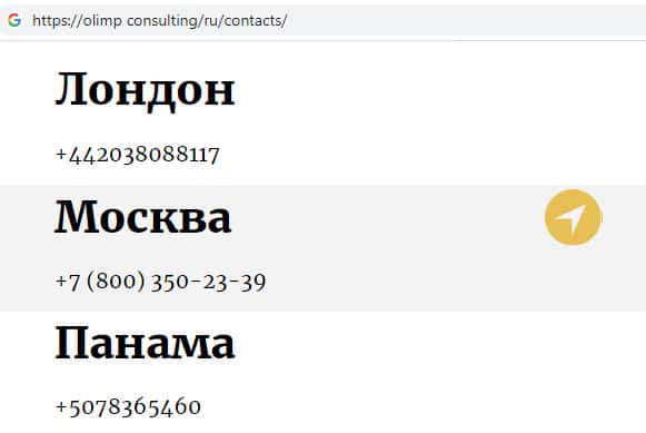 Шулера Олимп Консалтинг на своем дырявом сайте указали несколько номеров контактного телефона, с которых навязчиво названивают потенциальным жертвам: