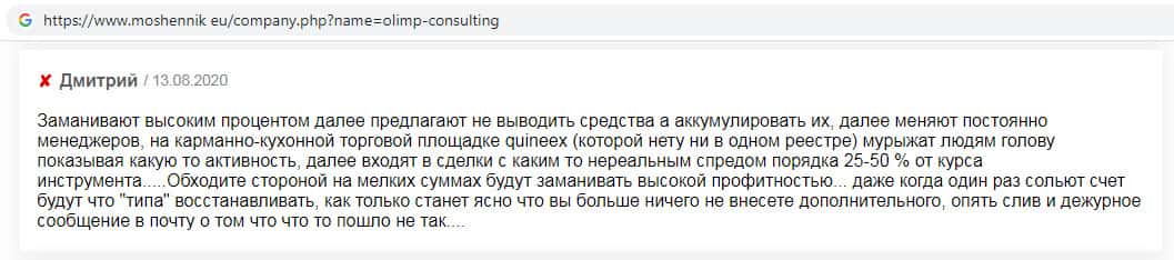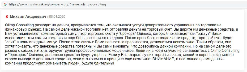 Жулики Olimp Consulting кидают людей на деньги и работают сообща с псевдо-брокером Quineex, положительным отзывам в интернете верить нельзя.