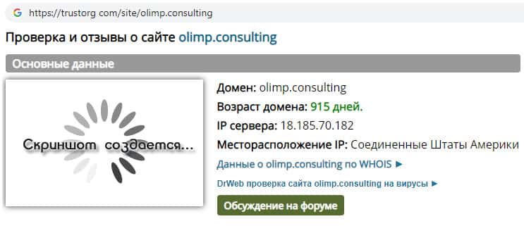 Проверка интернет-ресурса скам-конторы Olimp Consulting на trustorg com показала, что возраст домена к моменту написания статьи составляет 915 дней, скорее всего домен купленный.