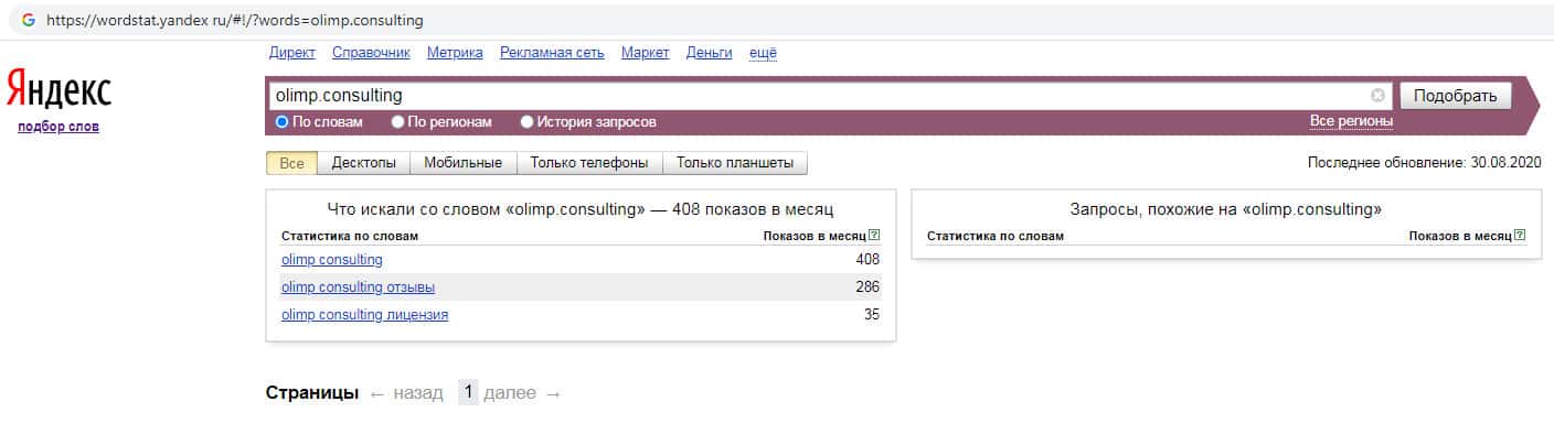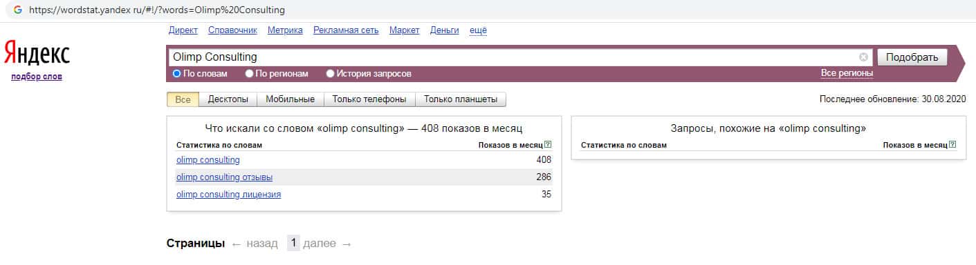 Количество брендовых запросов англоязычного названия компании с пробелом "Olimp Consulting" на Яндекс Вордстарт составляет 408 запросов за месяц.