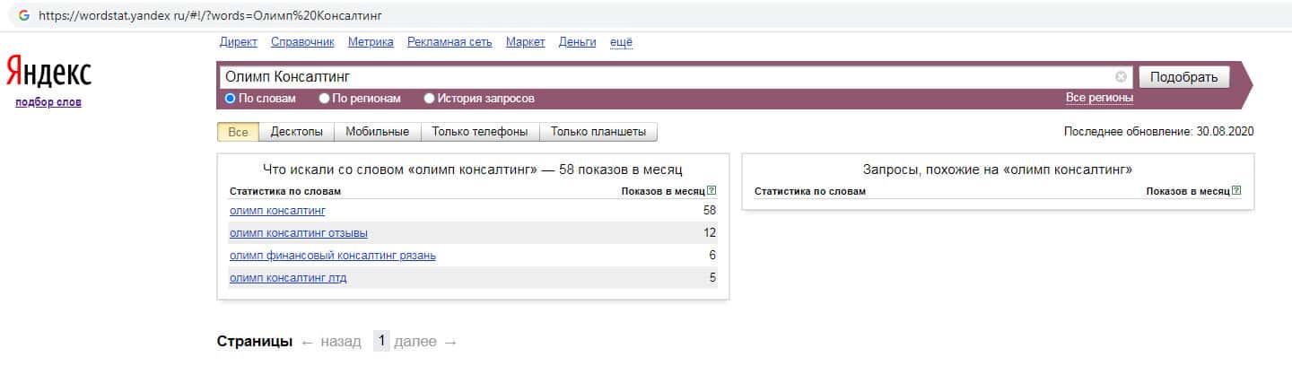 Количество запросов по бренду названия компании на русском языке с пробелом "Олимп Консалтинг" в поисковике Yandex составило 58 показов за месяц.