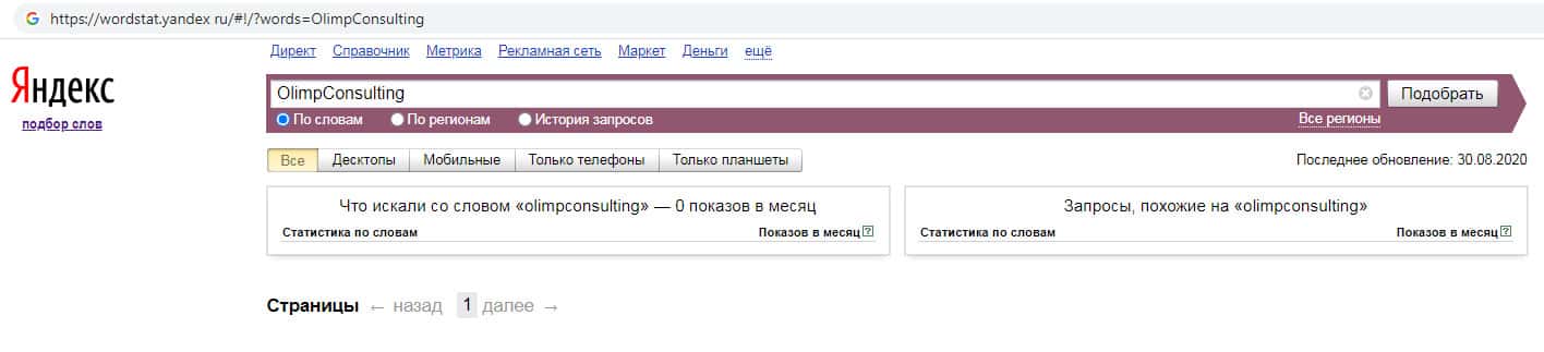 По запросам по бренду названия компании на русском языке без пробела "ОлимпКонсалтинг" на wordstat yandex ru также нет никаких данных.