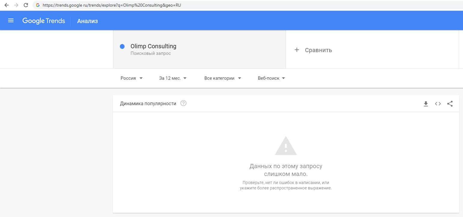 По брендовым запросам названия компании на английском языке без пробела "OlimpConsulting" на Трендс Гугл Ру информация отсутствует.