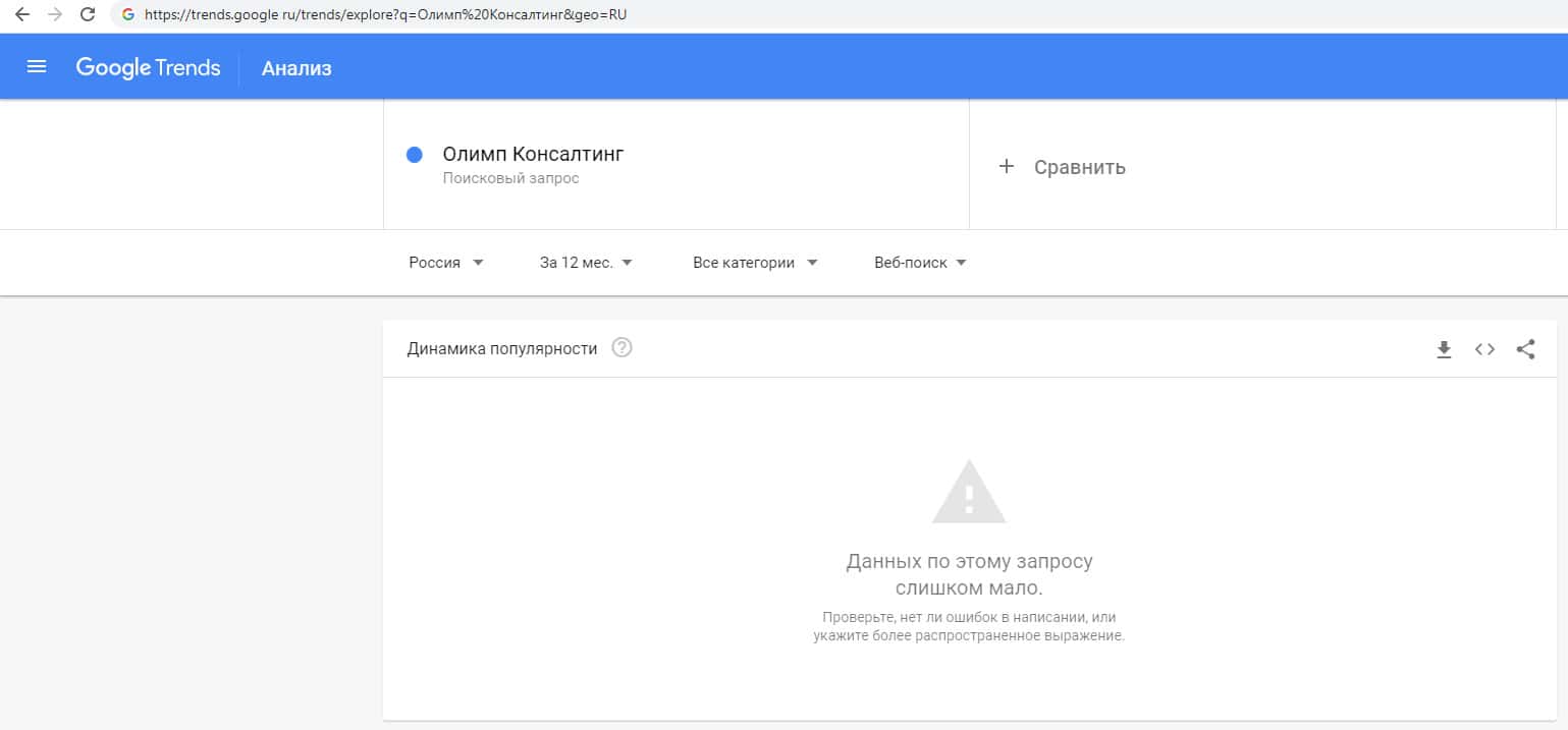 О запросах по бренду названия компании на русском языке с пробелом "Олимп Консалтинг" на trends google ru также ничего не известно.