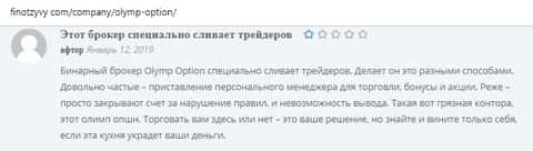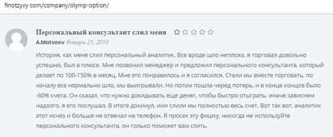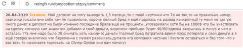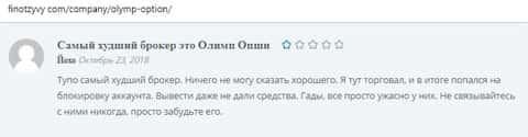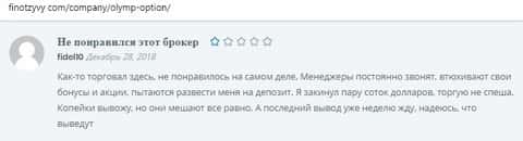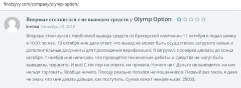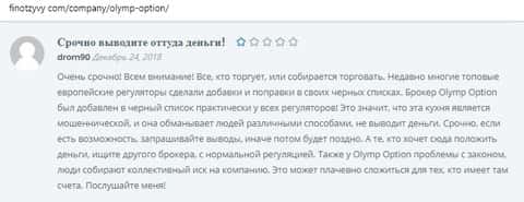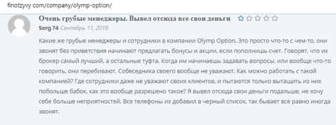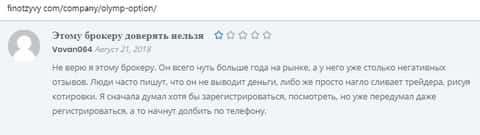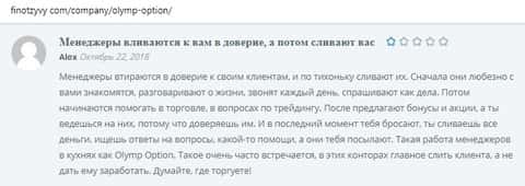 Еще одна жалоба-отзыв была найдена на просторах интернета, в которой человек рассказал как работают менеджеры OlympOption, и что по поводу вывода денег. Аферисты используют психологическое давление до тех пор, пока не получат от клиента хотя бы пару сотен долларов. После же, на запросы на вывод никто не реагирует.