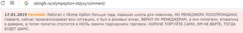 Вот отзыв от человека, который рассказал, что в кухне OlympOption занимаются полным кидаловом. Он успел часть вывести, когда аферисты еще позволяли делать для прикормки жертвы. Но когда клиент стал выводить основную часть денег, то тут мошенники стали выдумывать отмазки и пострадавший денег больше не увидел.