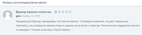 Отзыв написан человеком, который сам попробовал поработать с лохотроном OlympOption. Он сделал следующие выводы: навязчивые менеджеры, зависает платформа, техническая поддержка молчит. И это только короткий перечень недостатков, который таит веб-еонтора Олимп Опцион.