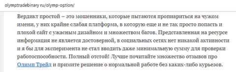 Очередной веб-портал высказался не в пользу конторы OlympOption. По их словам - это мошенники, которые пытаются пиариться на чужом бренде. Кухня имеет множество недочетов, ужасную торговую платформу и все выглядит настолько печально, что страшно даже закидывать сумму для проверки работоспособности их системы.