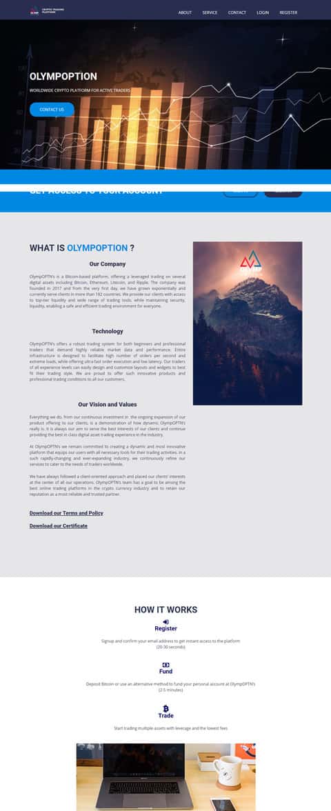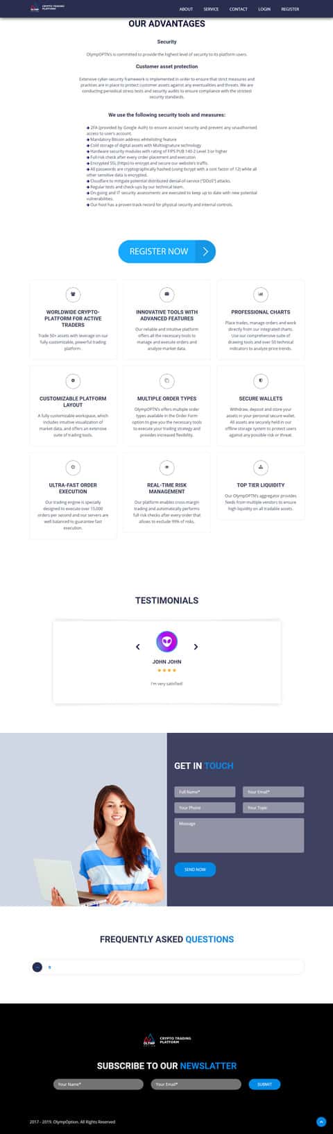 Официальный интернет-портал кухни Олимп Опцион сделан в виде сайта-одностраничника, который несет мало информации вообще о деятельности самой конторы. Брокер использует данный ресурс только для заманивания новых лохов к себе в мошеннические схемы, раскидывая по всему сайту кнопки с регистрациями.