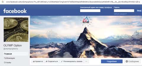 Кухня бинарных опционов Олимп Опцион также ведет свою мошенническую деятельнсоть в социальных сетях. Она сделала упор на социальную сеть Фейсбук, поддерживая при этом постоянный поток новых жертв. Далее представим скришот и ссылку на их группу facebook com/olympoptions