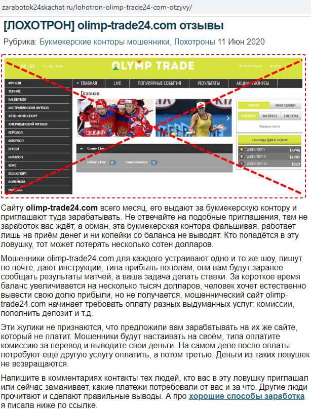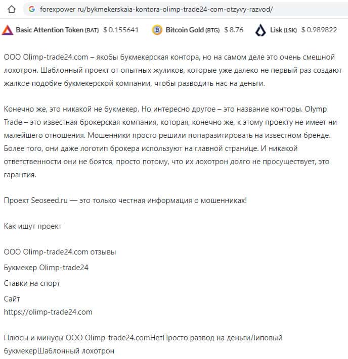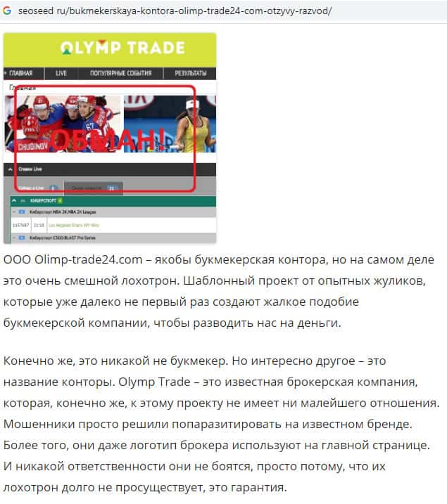 Еще один сайт-обзорник seoseed ru прямо заявляет о том, что контора Olimp-Trade24 - это обычная лоховозка, а ни какая не букмекерская контора.