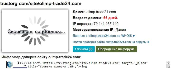 Сделав анализ на сайте ТрастТорг Ком мы видим, что домен olimp-trade24 com существует только 66 дней, а позиционирует себя, как букмекерская контора...