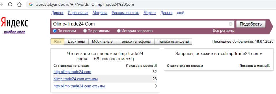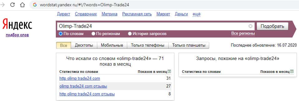 71 запрос показывает Яндекс по запросу о конторе "Olimp-Trade24". Значит на территории РФ информацию о конторе ищут.