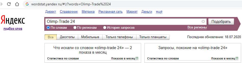 Количество запросов на английском языке только с пробелом "Olimp-Trade 24" тоже не дало никаких результатов и равно 0. По такому запросу информации не ищут.