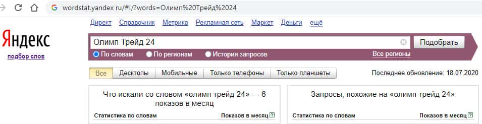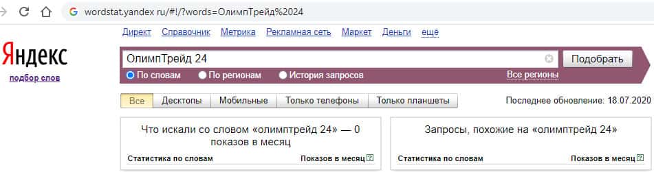 Запрос "ОлимпТрейд 24" с одним пробелом на русском языке тоже дал такие же результаты - 0 раз. По нему никто ничего не ищет.