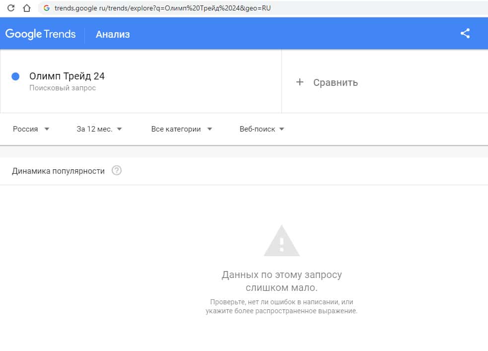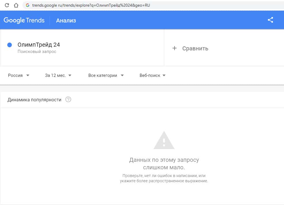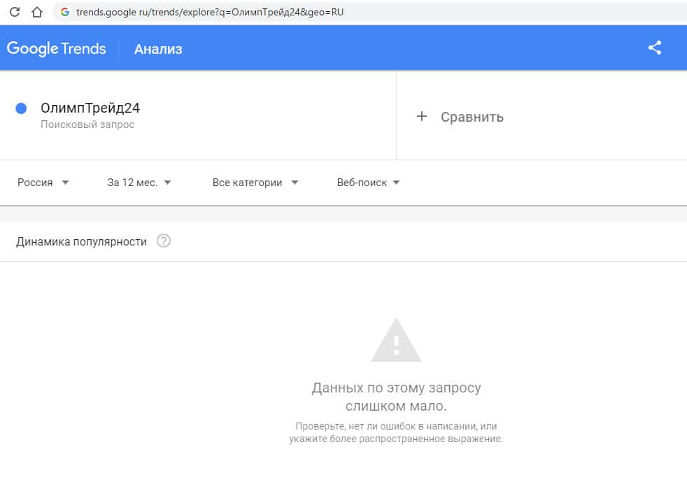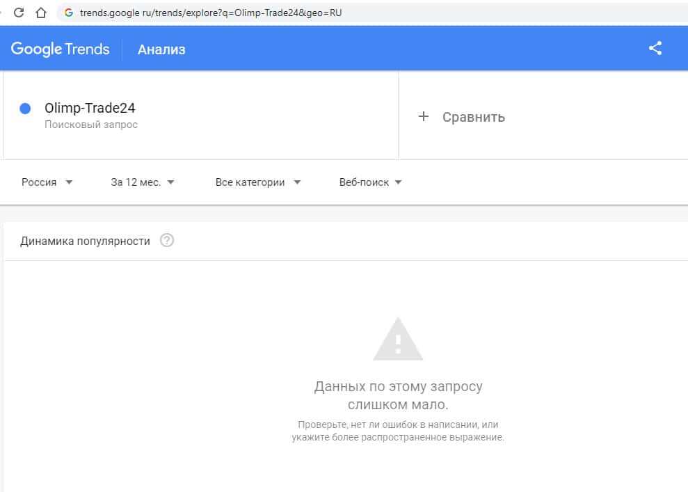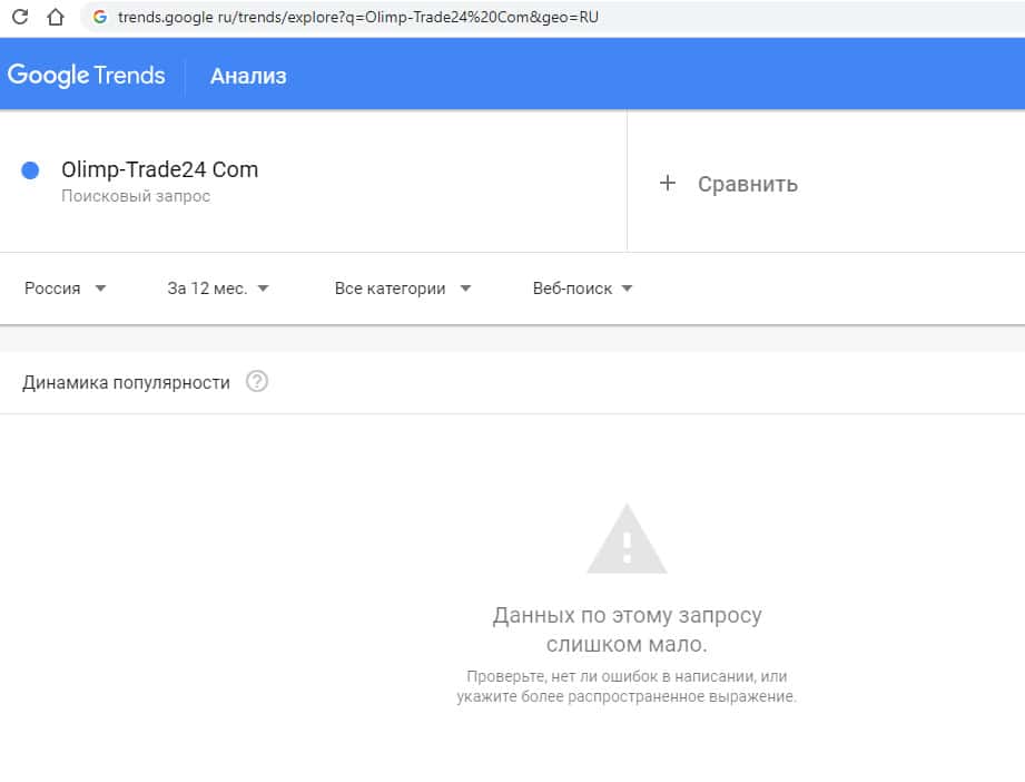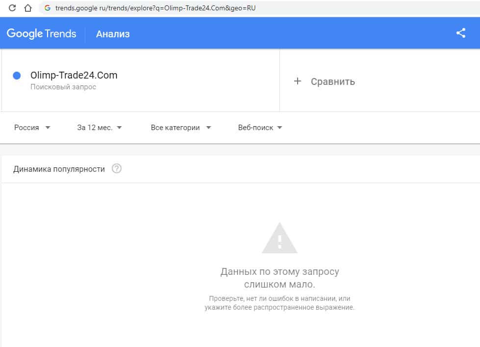 Такая же картина по запросу в "Google Olimp-Trade24 Com". Оно тоже составило 0 раз и никто так информацию не искал.