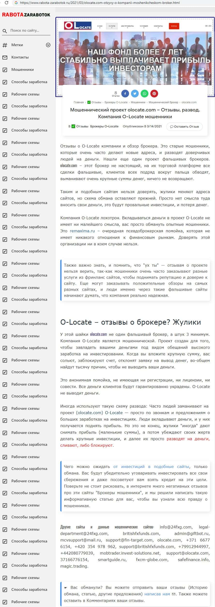 - Обзоры, разоблачающие махинаторскую консультационную контору OLocate, найденные в интернете