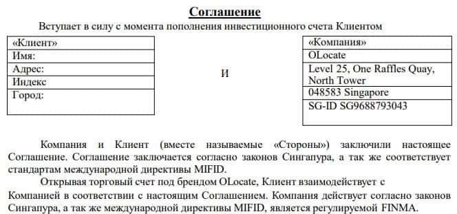 Далее Вы можете ознакомиться с текстом полного клиентского соглашения фейкового инвестиционного проекта ОЛокейт и убедиться, что оно имеет множество подводных камней.