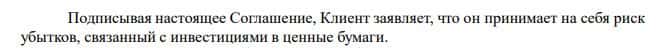 Далее в договоре с ОЛокейт указывается, что трейдер принимает на себя риск убытков, связанный с инвестициями в ценные бумаги. Снова шулеры пытаются выйти сухими из воды.