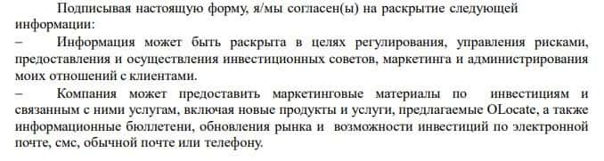 Далее в соглашении с OLocate говорится, что подписывая договор, трейдеры дают согласие на раскрытие их персональной информации. Но это нарушение конфиденциальности.