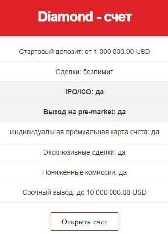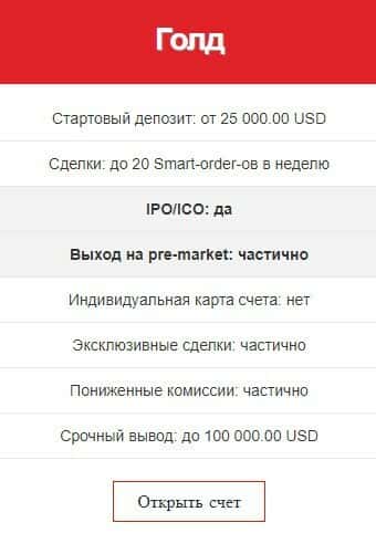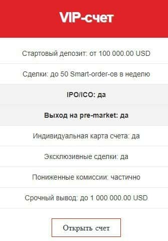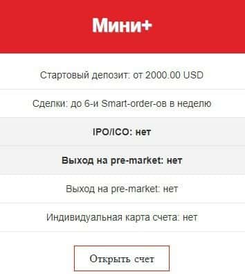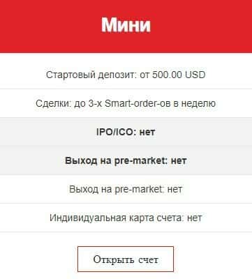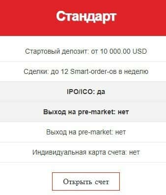 "Стандарт" торговый счет предполагает стартовый депозит: от 10 000.00 USD, наличие IPO/ICO и сделки: до 12 Smart-order-ов в неделю. Но это не лучшее предложение на рынке.