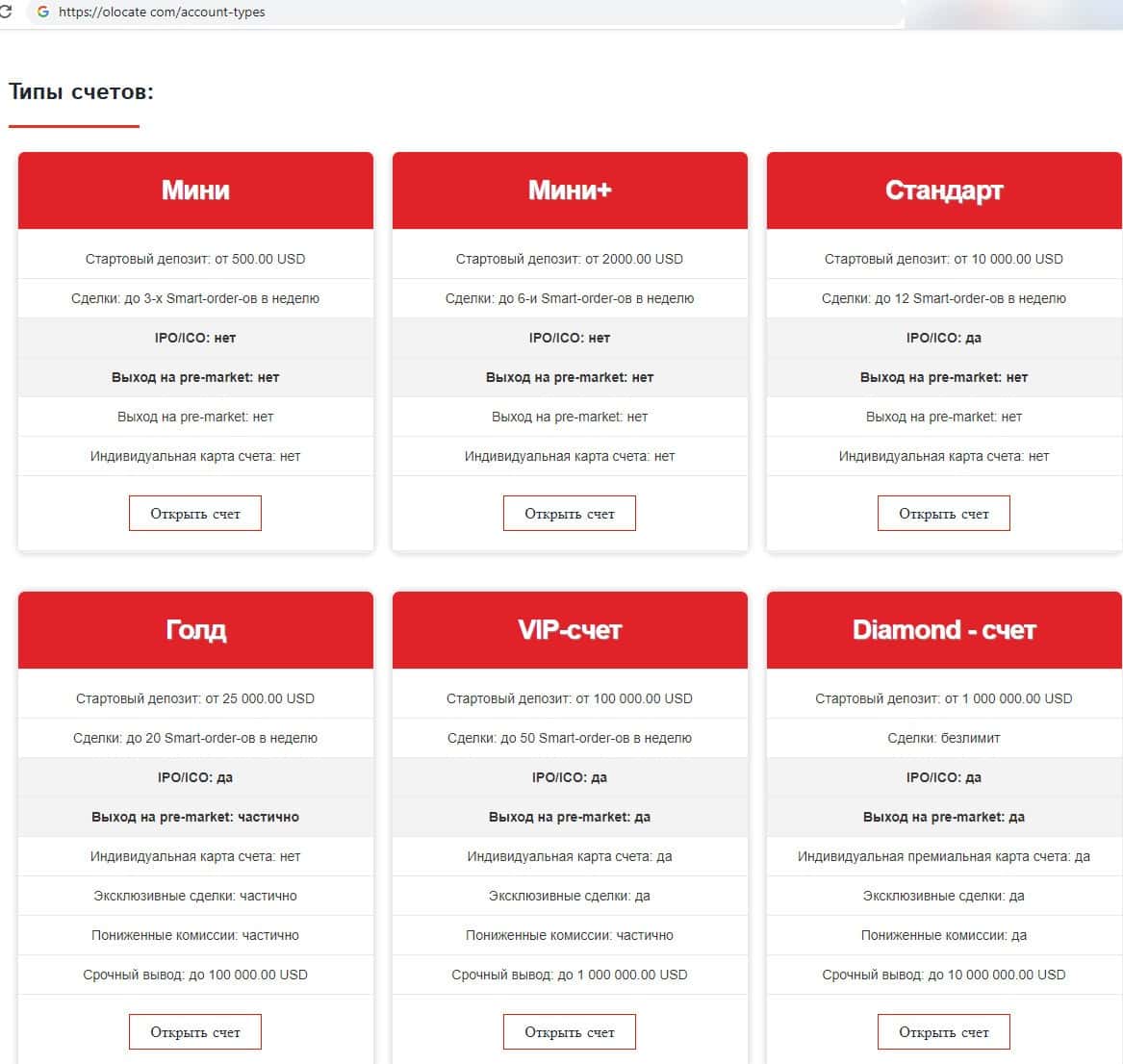 Если клиента все же разведут на открытие торгового счета у аферюг OLocate и вложения денег, то предложат один из 6-ти торговых счетов - Мини, Мини+, Стандарт, Голд, VIP и Diamond.