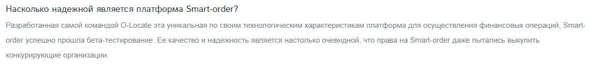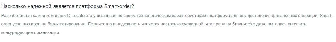 Жулики OLocate убеждают клиентов, что их платформа надежная, и это является настолько очевидным, что права на Smart-order даже пытались выкупить конкурирующие организации.