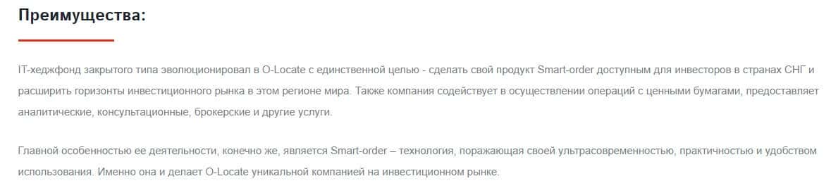 Ворюги OLocate уверяют новичков, что главной особенностью их деятельности является Smart-order, поражающая своей современностью, практичностью и удобством использования.