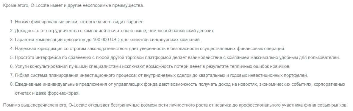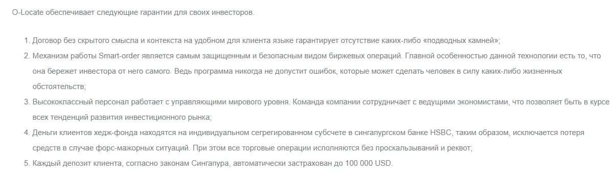 Проходимцы OLocate называют основными преимуществами работы с ними: гарантии компенсации депозитов, низкие риски и другое. Но не нужно вестись на пустые обещания ворюг.