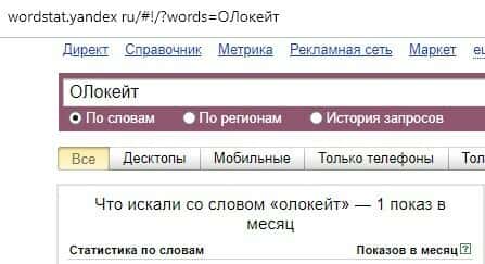 Количество запросов по брендовому имени "ОЛокейт", вбиваемого без пробелов на русском языке, совершенных в поисковой системе Яндекс, достигло всего одного показа в месяц.