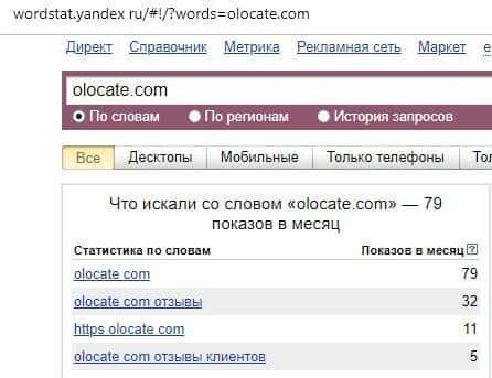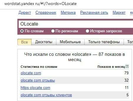 Англоязычный вариант доменного имени "OLocate", вбиваемого без единого пробела в поисковике Яндекс.Вордстат, набрал целых 87 показов по запросам за весь месяц.