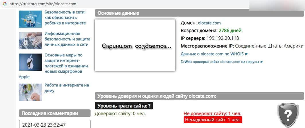 Согласно данным с трусторг кам, возраст домена плутовского центра OLocate составляет 2786 дней с расположением в США, и по 1-му человеку не доверяю и считают ненадежным сайт.