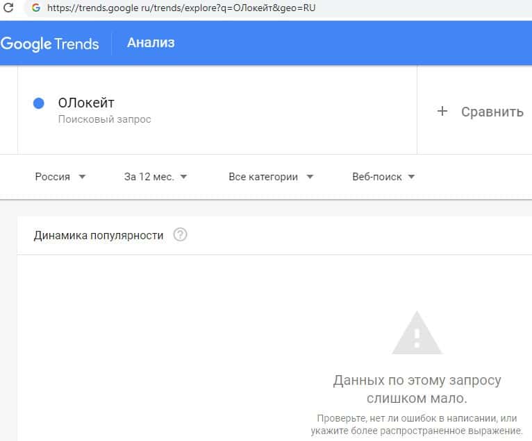 Что касается доменного имени "ОЛокейт" на русском языке, написанного без единого пробела, вообще не предоставил результата по поиску на интернет-странице Гугл Трендс.