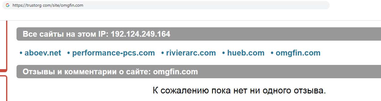 Проверив айпи, который используют жулики OMGFIN мы заметили, что на одном айпи находятся 4 компании не считаю мошенников. Все эти сайты являются интернет магазинами. Очень странно, что такая серьёзная контора делит свой айпи с другими компаниями, которые никак не связанны между собой, выходит, что не такая уж и серьёзная фирма.
