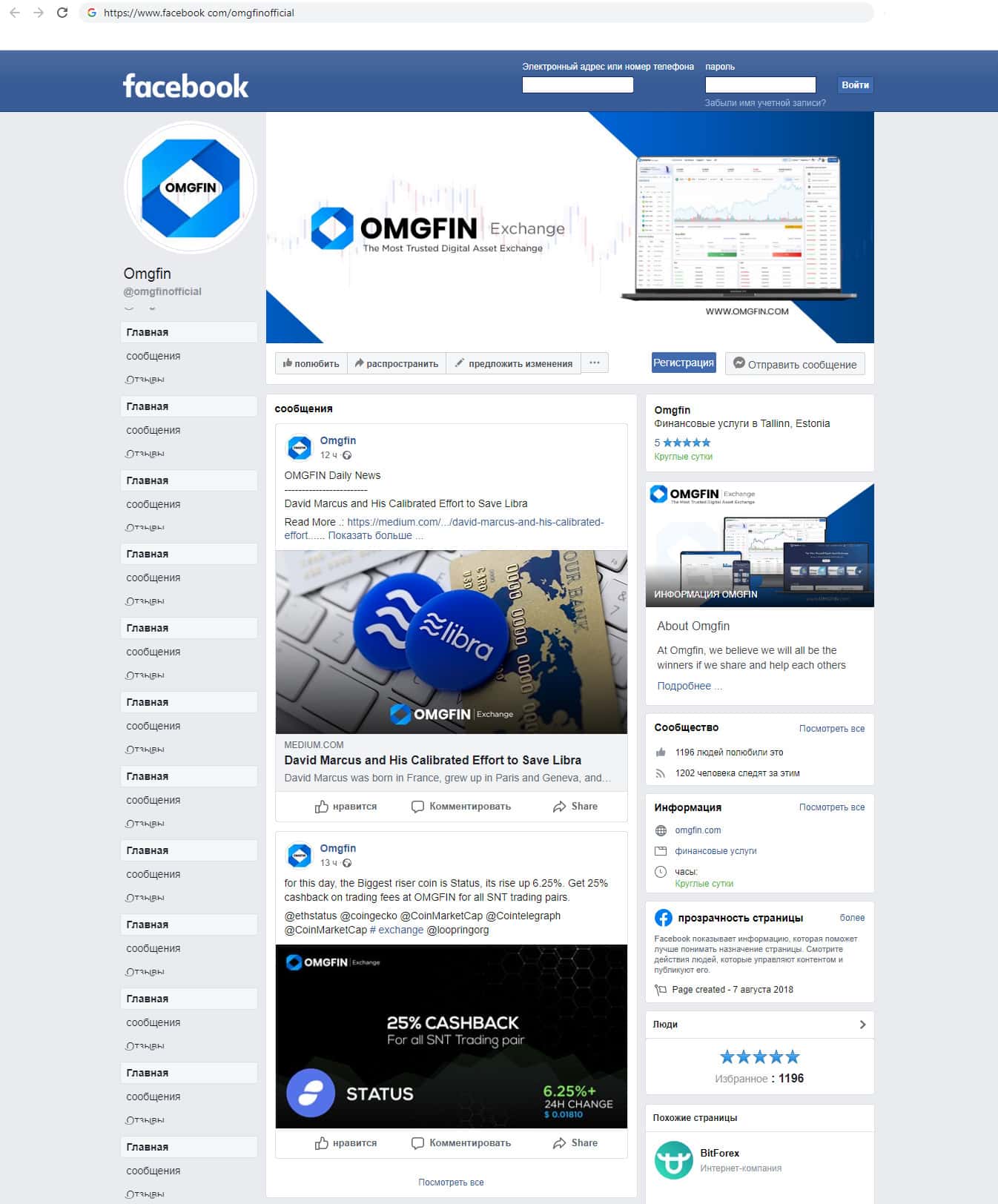 Так же махинаторы OMGFIN не обошли стороной самую популярную социальную сеть в мире - фейсбук. Там жулики так же имеют аккаунт, который набрал более тысячи подписчиков. Число это довольно не маленькое, если учесть тот факт, что мошенники с каждого из бедолаг могут поиметь деньги. В итоге мы имеем более 1000 обманутых людей.