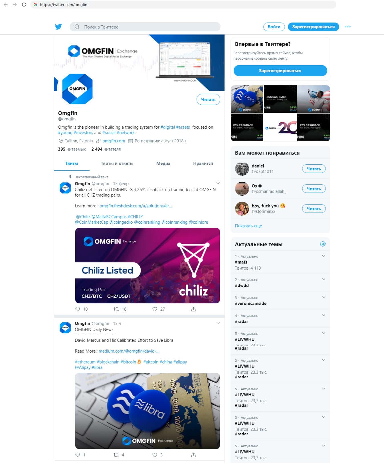 Так же мы обнаружили аккаунт в твитере. который так же принадлежит аферистам OMGFIN. Здесь дела у них обстоят лучше, так как страница набрала почти 2500 подписчика. Для жуликов не маленькое количество людей, но для крупной компании очень мало. Так что тут сразу видно разводил, которых интересуют только деньги инвесторов.