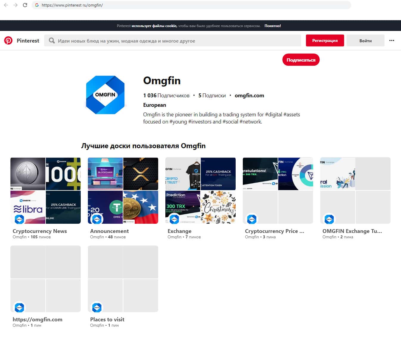 Фотохостинг Pinterest так же содержит страницу жуликов OMGFIN. Страница набрала более тысячи подписчиков. Это конечно не большое количество подписчиков, но учитывая количество социальных сетей, то собирается приличное количество людей, которых компания аферистов обрабатывает для того, что бы привлечь в свою финансовую ловушку.